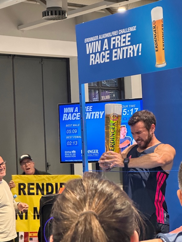 We arrived at Adina hotel and checked in and then went to Messe for the race check in. So many people! There were great themed activities at the expo like this guy won a free entry into the marathon for handing this stein for over 6 minutes.