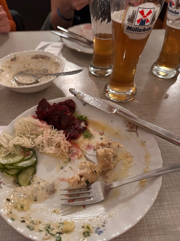 Once we wrapped that up we headed out for dinner, Christiane’s favorite German treat - Knödel! Knödel is basically a boiled bread/potato ball that is served with sauce. 2 of them were pretty filling - I got a cheese and a bacon one. Then we got this delicious mushroom sauce that we put on them and some salad. It was wonderful! They even had a dessert Knödel, which was also delicious. We spent most of the dinner talking about how to say Knödel which was a complete disaster: “say it like this”… “That’s what I’m saying”… “no that’s definitely not what you’re saying”. Our waitress here was actually a nice German waitress so that was refreshing.