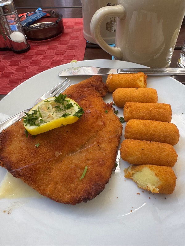 Anyway, lot of really cool stuff we learned at Heidelberg Castle, and with amazing views of the Neckar River. From there we took the more modern funicular down to the old city (Aldstadt), and walked around the commercial streets. We had lunch at a cool spot called Löwenbräu, where I started training for Octoberfest. I had a Radler (half lager half lemonade) and another schnitzel, this one with a fried egg on top, also delicious!