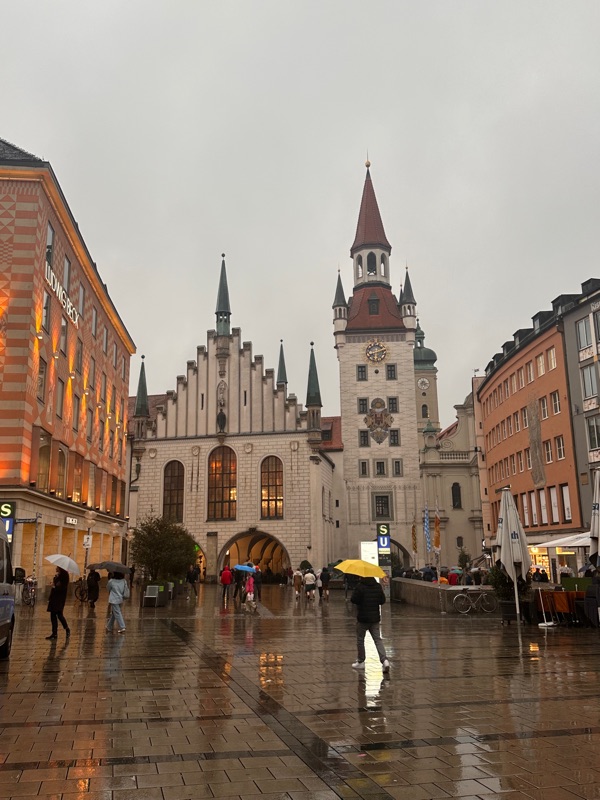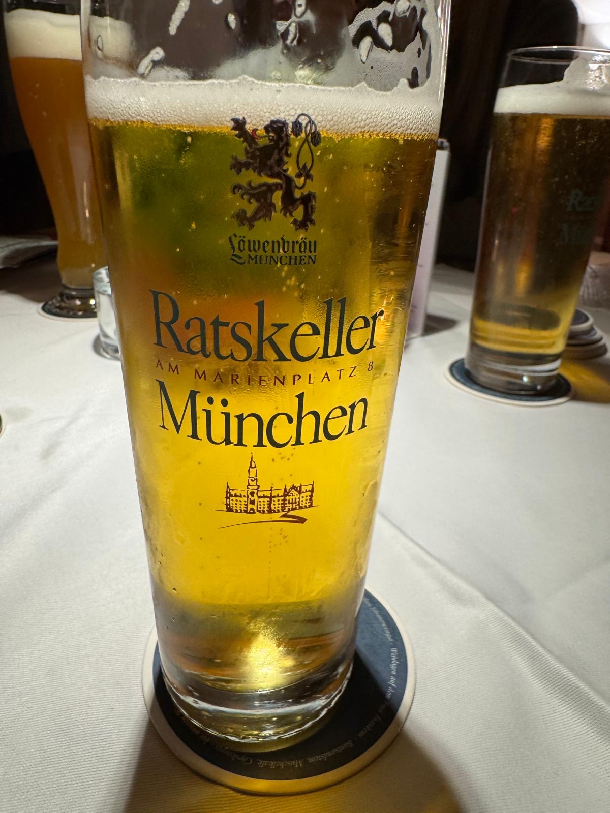 We left Dachau and headed to the Aldstadt (Old City) for some lunch. We started in Marienplatz and found a lovely restaurant in this majestic building that turned out to be the Old Town Hall. The restaurant was called the Ratskllar which I loved because that was the name of the bar we went to for chicken fingers and fries after volleyball practice at Catholic University. The name Rathskeller or Ratskellar literally means the bar in the basement of the town hall.
