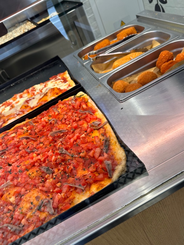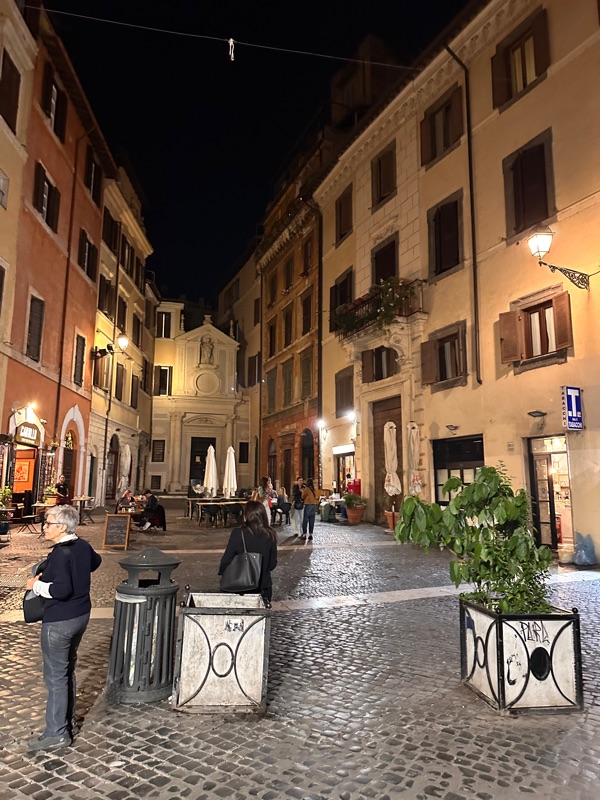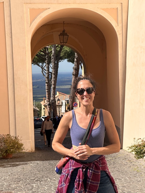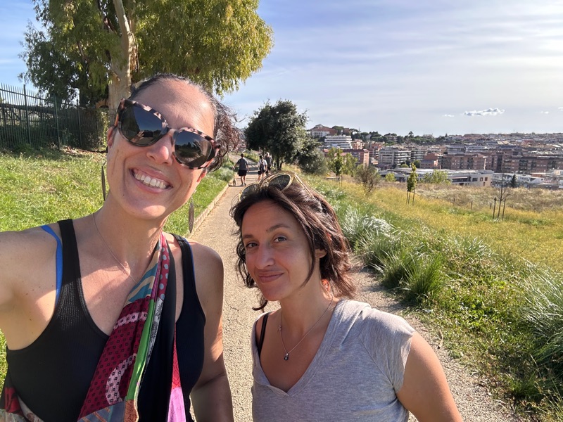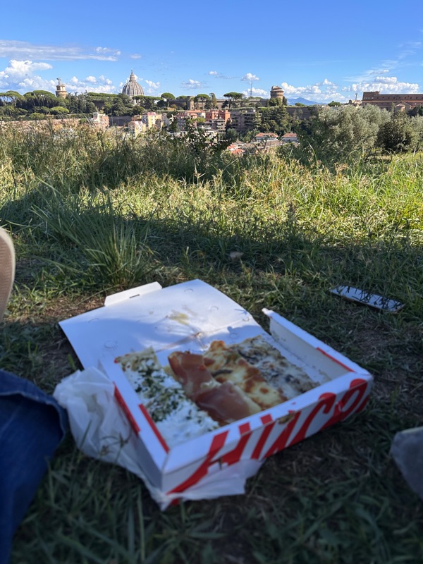 There is a walking and bike path that is close to Balduina that gives an amazing view of St. Peter’s and Vatican City. We began by stopping at Alice for some pizza al taglio (yum) and suppli. I can never remember the difference between suppli and aranciata but this one had risotto but carbonara flavored, which was amazing. Livia talked me into squash blossom and anchovies pizza, then we had mushroom, potato, and straciatella. It was all great, a little sampler in a pizza box for us. Still don’t know why this hasn’t caught on in the US, or anywhere else for that matter. So we walked through the hills of northern Rome to Parco Monte Ciocci where we sat on the grass and chatted about life. It was a busy Sunday afternoon with lots of classes and activities going on - Parkour, Dance, Pickleball, Biking, lots of energy at the top of the hill. On our walk down we happened to be walking at the same pace as this young boy riding his bike saying how much faster he rides his bike than his parents. He was the cutest, and also so cool how in Rome it really feels like it is taking a village to raise a child. We stopped at a cafe for a coffee and enjoyed the amazing weather. I’ll tell you, this trip I have worn winter and summer clothes and everything in between.
