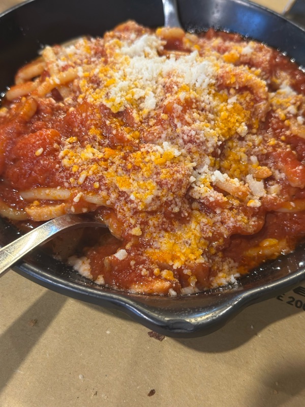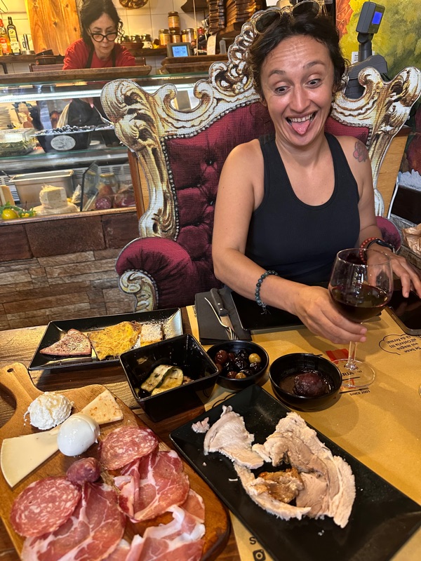 Our next stop was Ariccia which is famous for the Fraschetta. This is a type of little restaurant, maybe with the Italian version of tapas. Because it was Monday there wasn’t a lot open, but there was a little strip of Fraschette that were all open and in heavy recruitment mode. We decided to go into one, clearly family owned, and they had 2 menu specials - one was basically an appetizer sampler on steroids, and then the other option was an appetizer sampler with a primo and secondo (a pasta dish and a meat dish). Thank god we just went with the appetizers for 21 euro because it was huge! We also got a lardo bruschetta and some chicory. The owner of the restaurant kept talking to us, I think he was a little excited to have an American there. He brought over the English version of his write up about fraschette and also porchetta, which is a special way of smoking pork that this village is known for. Of course that was one of the delicious appetizers. Then he showed me a picture of Laura Bush eating porchetta, I guess you’ve arrived if you’re feeding a First Lady! The Owner liked us so much that they happened to have an extra pasta dish (bucatini all’amatriciana -pasta with red sauce and guanciale) that they asked us if we wanted - how could we say no? But we walked out sooooo full.