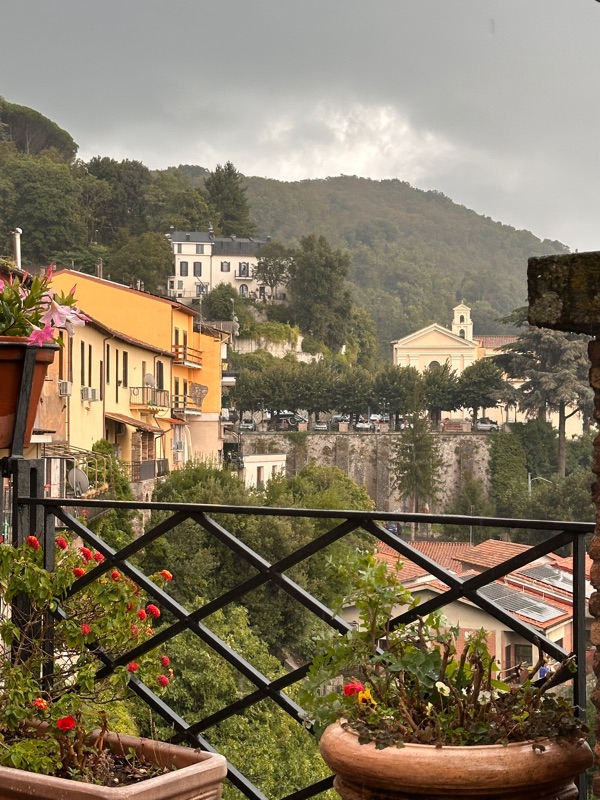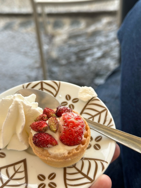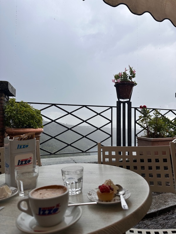 Our last village we stopped in was Nemi, but it had started to rain as we left the restaurant in Ariccia. We got out of the car in Nemi and started walking around and it promptly started raining. We went into this trinket shop which was really interesting to see. An older man just sat in the shop, completely content. I wondered if he even sold anything in a whole day, but again, just happy to be there and chit chat - the simple life! The rain got much worse so we sat at a table with a big umbrella and of course ordered a coffee and a little pastry. This cafe also looked out over a lake below, also surrounded by trees and beautiful. Nemi is known for its fragole - strawberries, and strawberry pastries. The one we got was just delicious, though the strawberries seemed a little out of season. It was really pouring at this point so we waited for it to let up and headed back to the car for Rome, where it didn’t rain at all.